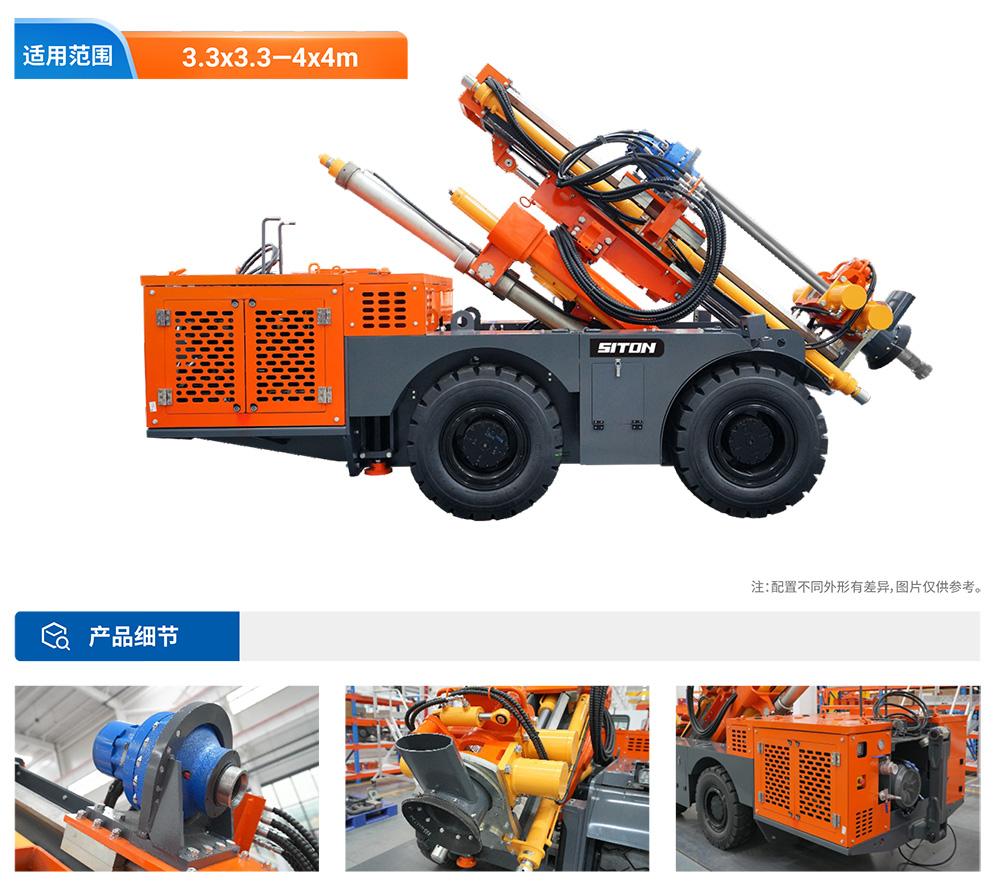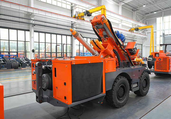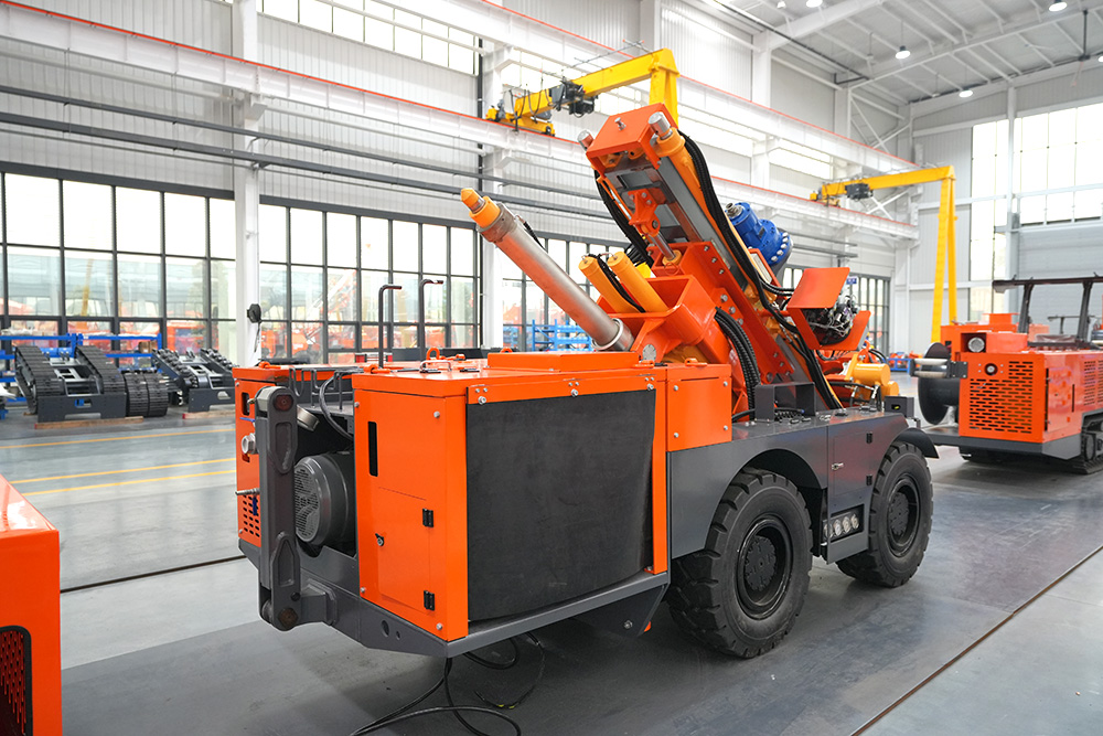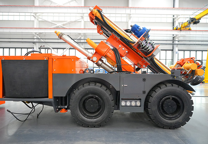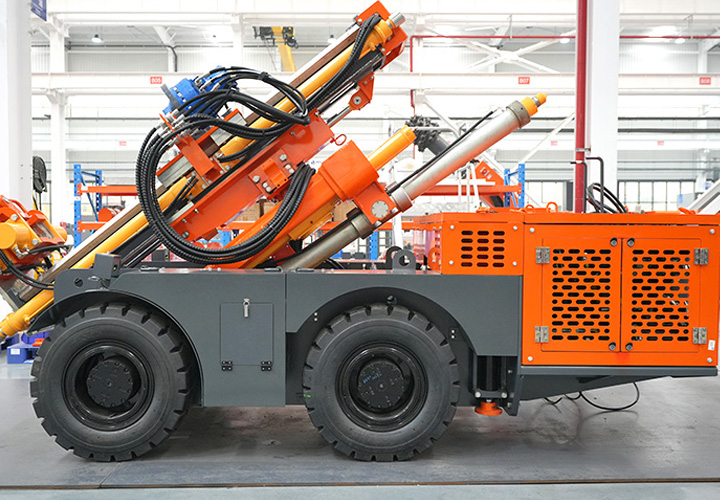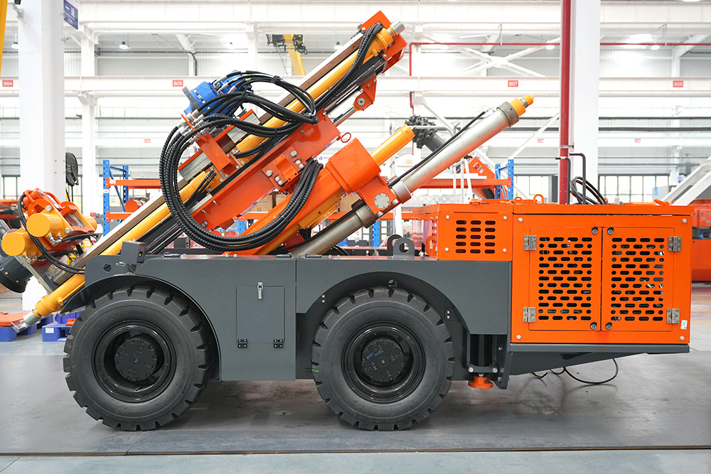 KODT-125是一款輪胎式礦用潛孔鉆機,電壓等級:380V,采用潛孔沖擊器作業(yè),閉式四驅液壓系統(tǒng),適用于3.3-4m地下采場環(huán)形孔的穿鑿,是專用的穿孔設備,也可用于天井和斜井的開鑿及回采作業(yè)。主要功能和裝置如下:適用于鉆孔直徑范圍120-254mm,鉆孔深度0-100m;鉆架可環(huán)向360°旋轉,前后-10°-55°度擺動,適用于環(huán)向打孔;鉆臂裝載有液壓穩(wěn)桿機構,保證鉆孔直度,偏斜率≤1%;機身配有頂升支腿和后擺動橋,可在路面坑洼惡劣條件下工作;設備四驅驅動,可實現(xiàn)360°轉彎,原地掉頭;長距離移動時,設備可解鎖制動,且配備牽引,方便使用拖車進行快速移動;鉆機回轉具有無級調速功能,可根據(jù)不同巖層狀況調整鉆速,提高效率;且設備配置遙控裝置,方便操作人員操作設備的同時,提高了操作安全性和可靠性;設備配備了沖洗裝置,方便操作人員清理設備,維持設備整潔,提高設備使用壽命。